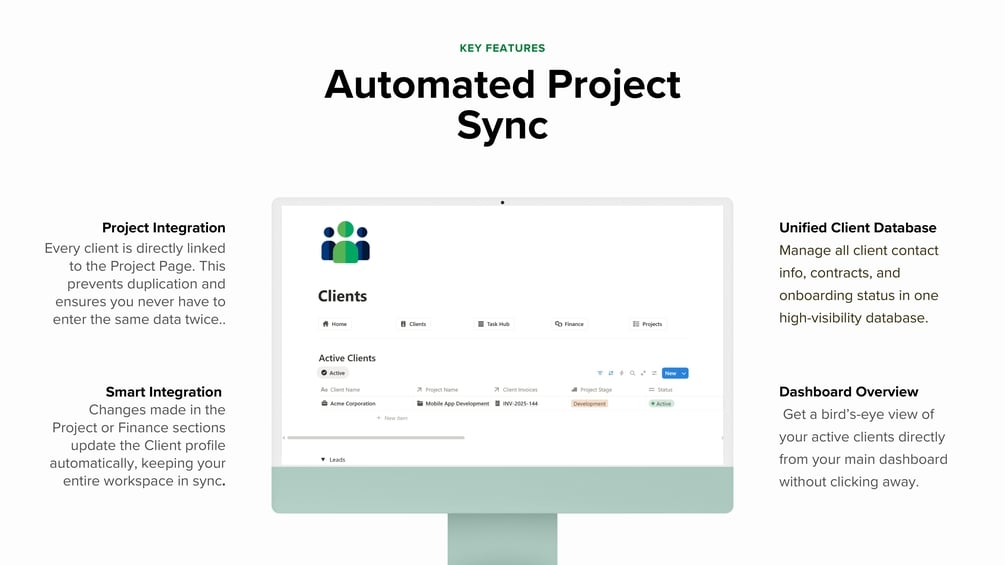 - Anti-Duplication Logic: Enter data once. Because our databases are linked intelligently, a change in a Project or Finance entry updates the Client profile automatically. No more writing the same thing twice.